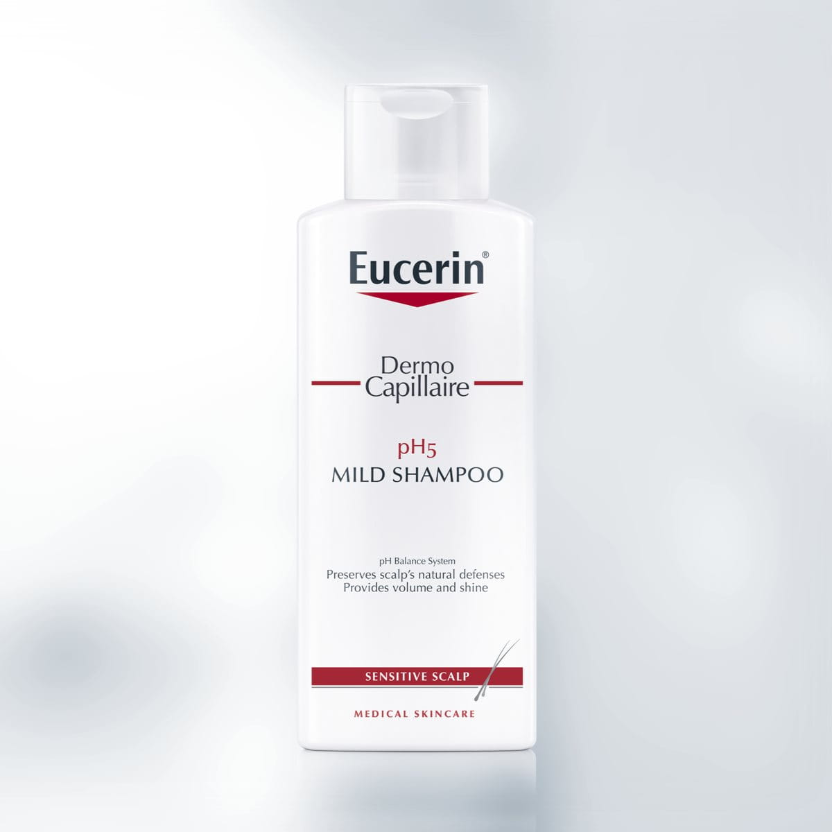 Uma pele saudável tem um pH entre 4,5 e 5,5, fazendo com que seja ligeiramente ácida. Esta acidez natural protege a pele contra bactérias nocivas e outras substâncias, pelo que, quando este equilíbrio é perturbado (por exemplo, devido a calor, frio, doenças, cosméticos ou stress) pode dar origem a um couro cabeludo sensível. O Eucerin DermoCapillaire CHAMPÔ SUAVE pH5 foi criado especialmente para manter o nível de pH natural da sua pele, limpando eficazmente o seu couro cabeludo e o cabelo para evitar secura e irritação. Lava a sujidade, o pólen e os alergénios, dando ao seu cabelo um brilho saudável e uma sensação de suavidade e flexibilidade.